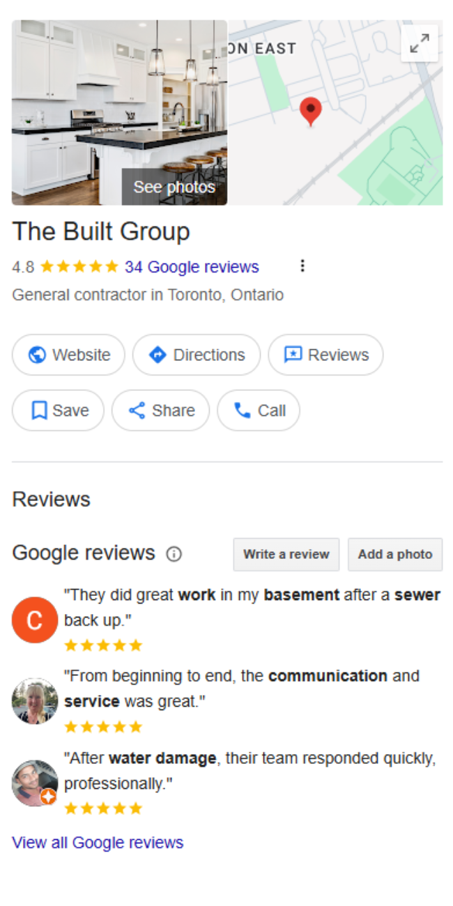 - A prominent position in Google Maps for local searches related to restoration and renovation.
