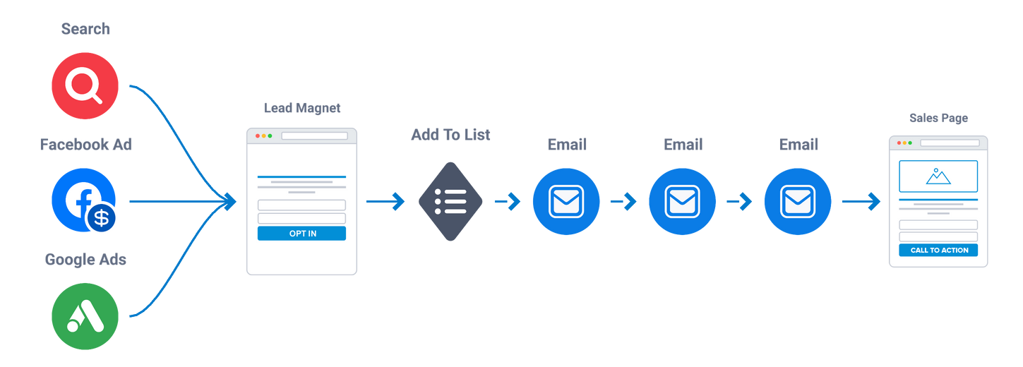 That's a simple sales funnel. A valuable download captures contact information. An automated email sequence delivers relevant content over 3-6 weeks. Each message provides value and includes a clear next step. When someone engages, your sales team receives a notification with full context.